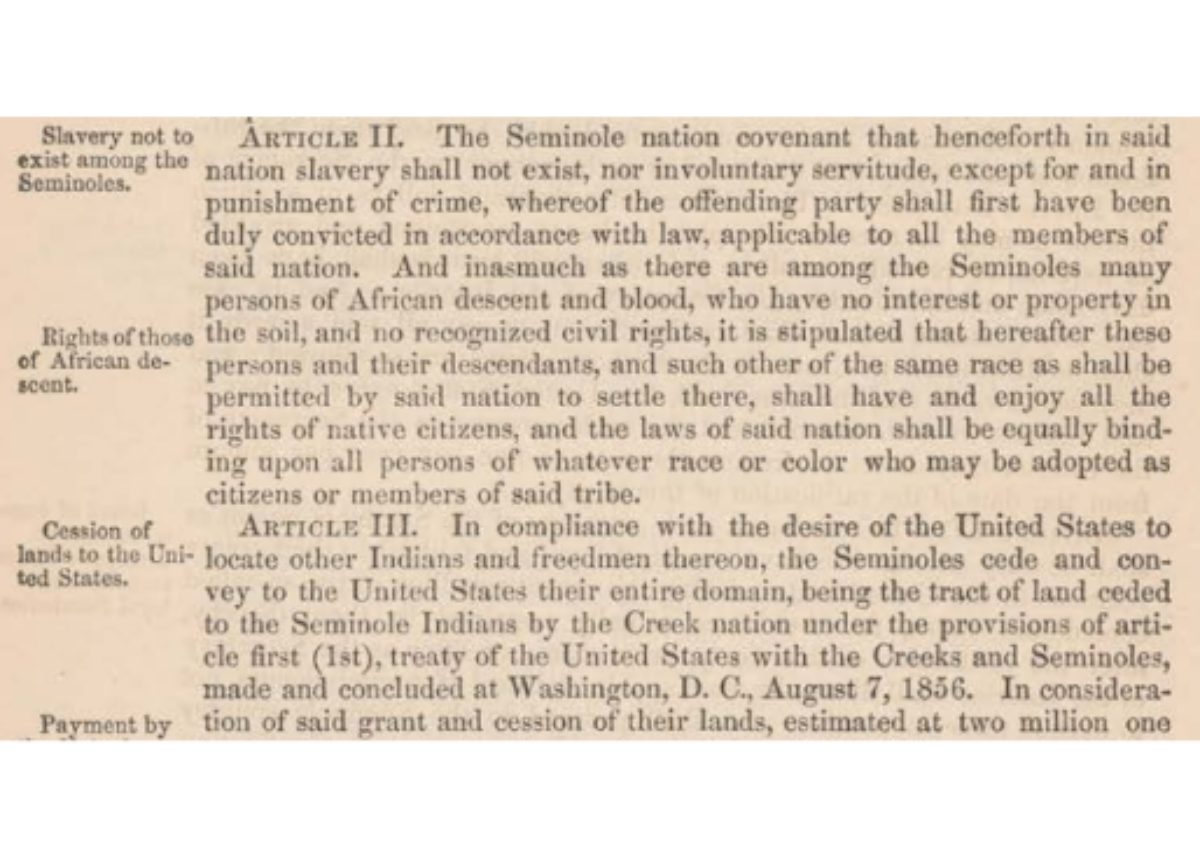 The 1866 treaty guarantees citizenship and equal rights to Black Seminoles and their descendants. There is no blood requirement and no expiration.